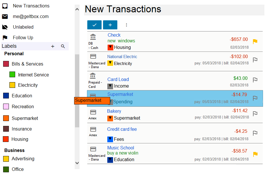 Geltbox has personal and business default labels. You can add your own labels and sub-labels in any language without limits. Geltbox automatically labels new transactions.