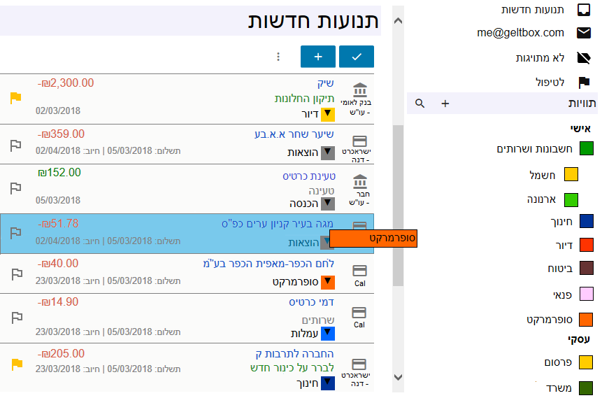 ל-Geltbox תוויות ברירת מחדל אישיות ועיסקיות. אפשר להוסיף תוויות ותתי תוויות חדשות בכל שפה וללא הגבלה. Geltbox מתייגת באופן אוטומטי תנועות חדשות.