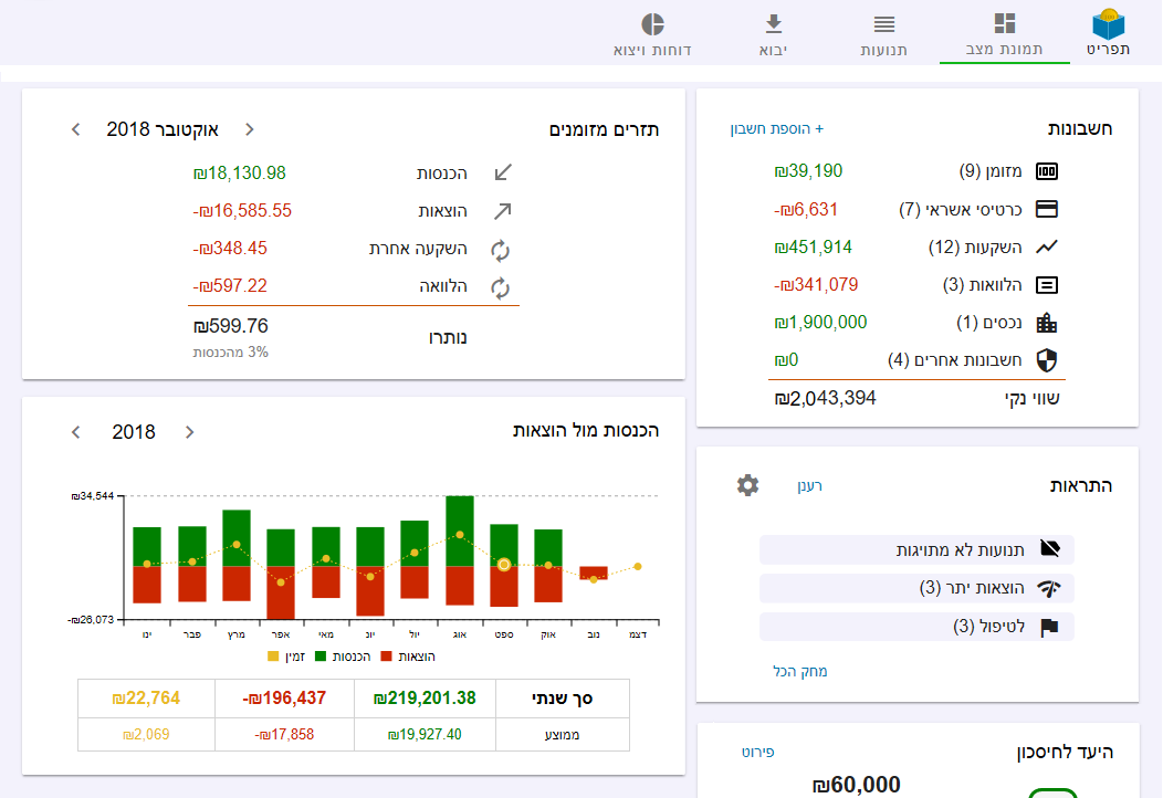 מסך אחד בלבד יציג לך תמונה ברורה ומלאה של החשבונות ותזרים המזומנים שלך.